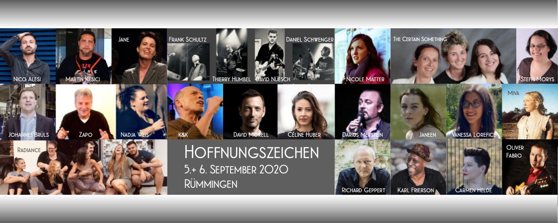 Seit Anfang der Woche steht das Line-Up: Über 30 Künstlerinnen und Künstler haben sich für das „Hoffnungszeichen“, Fest der Musik in Rümmingen angesagt. Einige echte Hochkaräter können die Veranstalter vorweisen: Darius Merstein, gefeierter, internationaler Musicalstar wird ebenso seine Aufwartung machen, wie Soul-Ikone Karl Frierson oder der Züricher Tenor David Morell. So wird insbesondere das Konzert „Grosse Stimmen – Grosse Lieder“, bei dem die 3 Sänger aufeinandertreffen zu einem Highlight des kleinen Festivals.